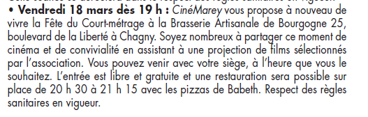 Cette année, L'équipe de CinéMarey a décidé d'être généreuse dans son engagement : proposer 2 soirées de diffusion de films de court-métrage.
