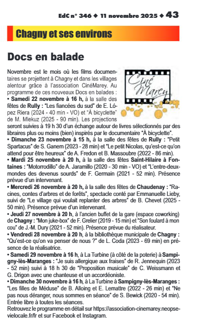 2 films et un pot d'ouverture le samedi pour l'après-midi, suivie d'uns soirée en partenariat avec la librairie de Chagny.